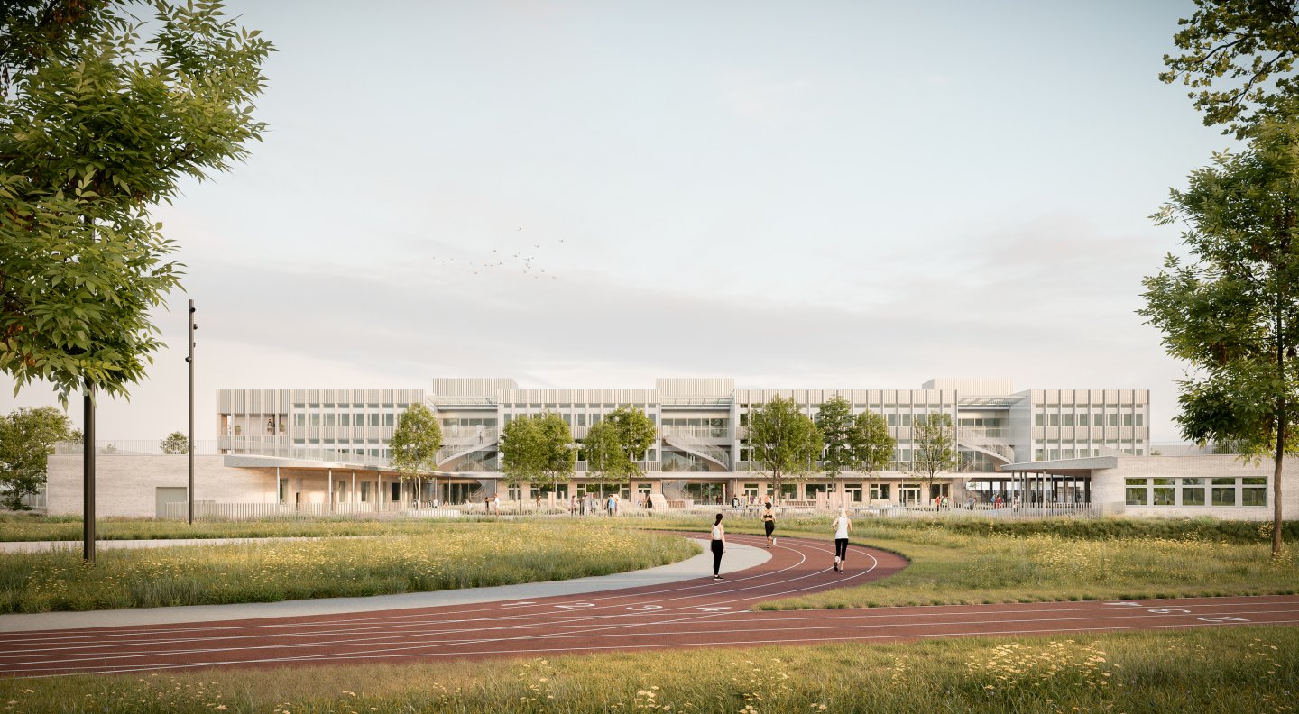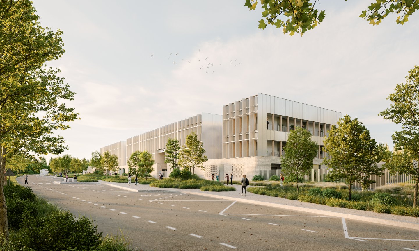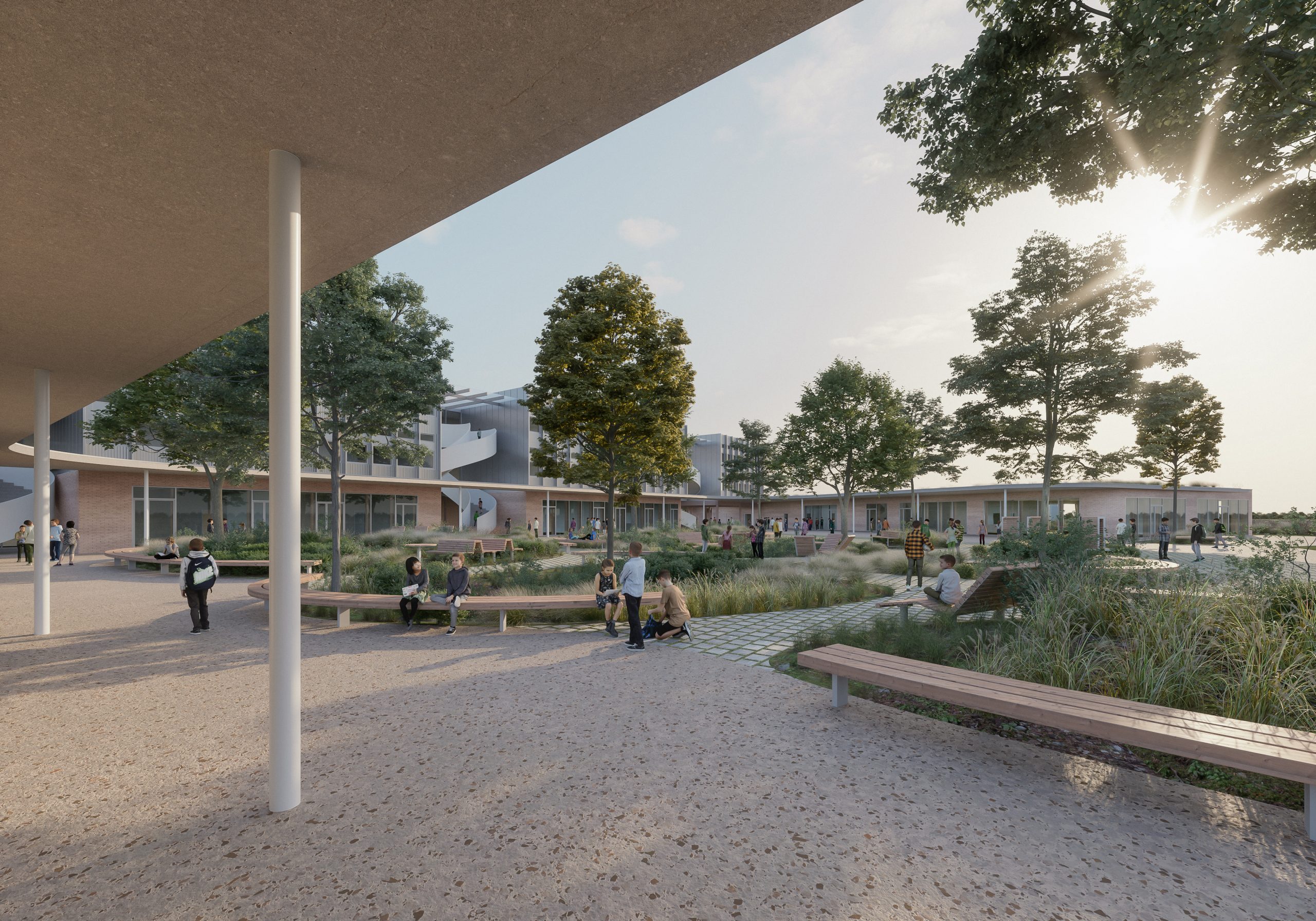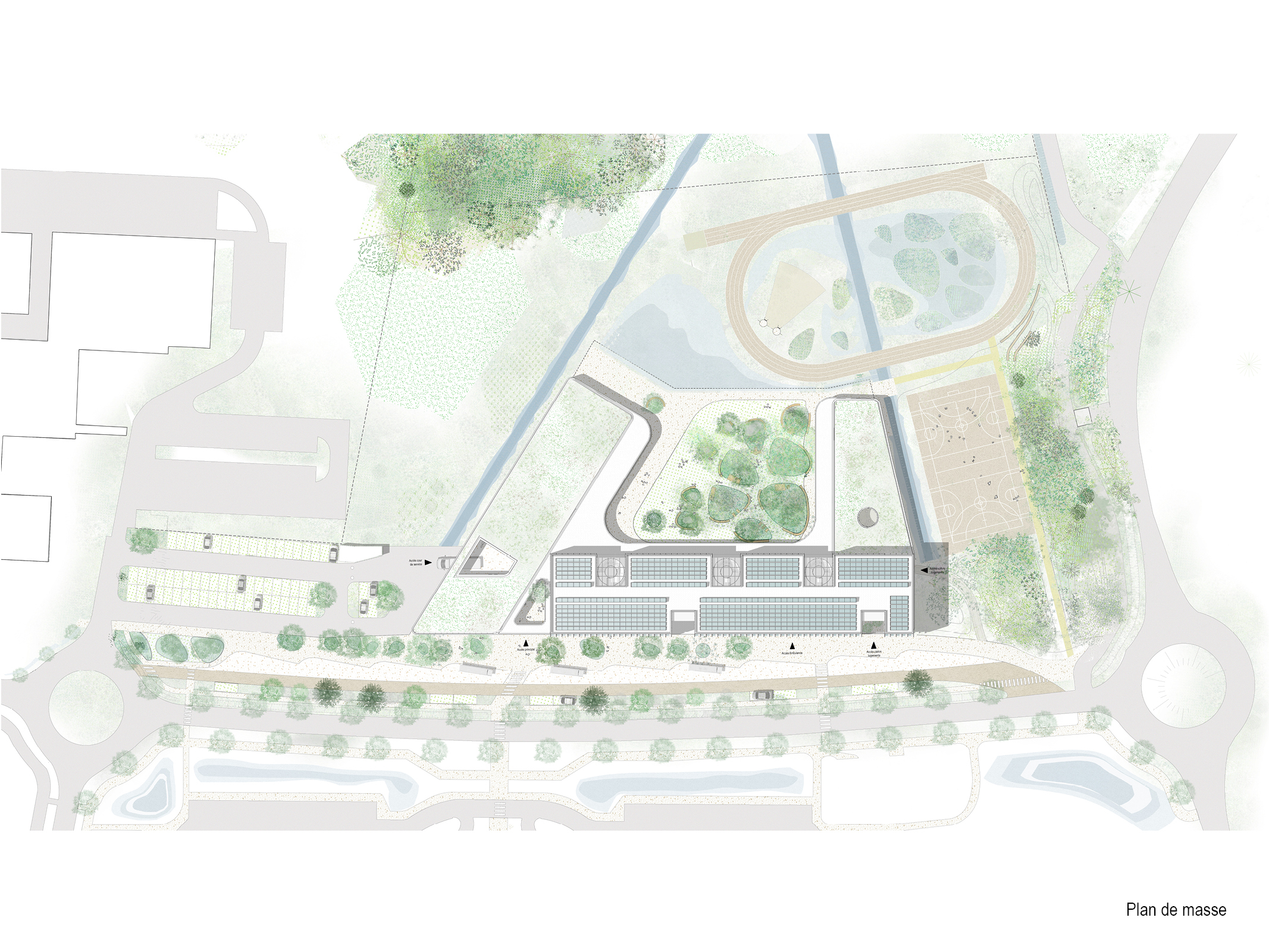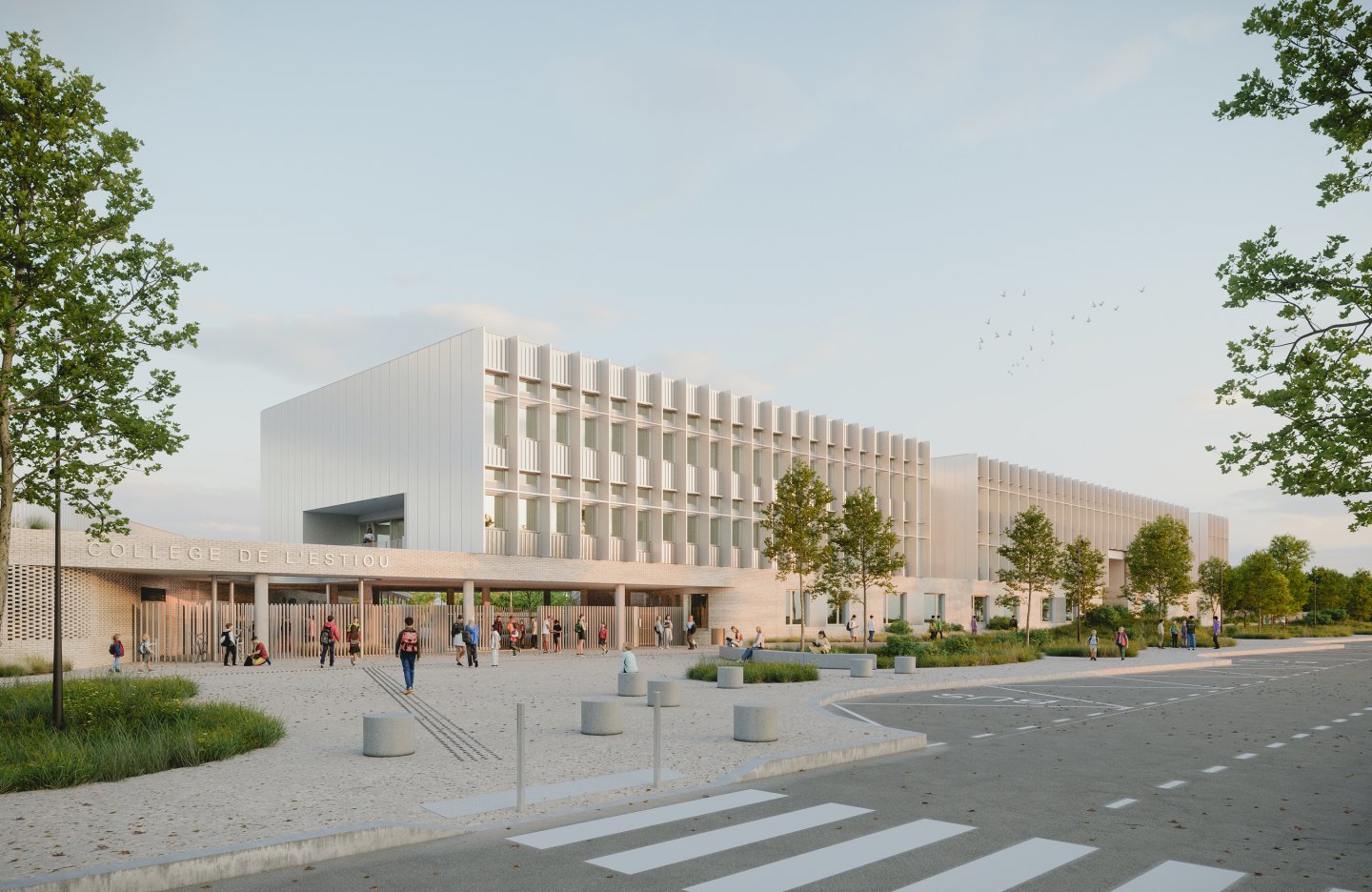 En préservant l’amplitude du plateau de la Ménude, le nouveau collège de l’Estiou s’appuie sur la trame héritée du parcellaire agricole afin d’implanter le futur bâtiment et la cour. L’importance donnée aux drains agricoles offre des interfaces entre différents milieux, certains seront des refuges pour la faune et la flore, d’autres seront l’objet d’activités sportives ou récréatives. Les espaces sont pensés en continuité les uns des autres afin de donner une impression d’ouverture et ainsi recréer les conditions initiales du plateau. Dans cette optique la cour apparaît comme un poumon vert constitué de prairies et de bosquets, dont la limite est suggérée par un jeu subtil de topographie.